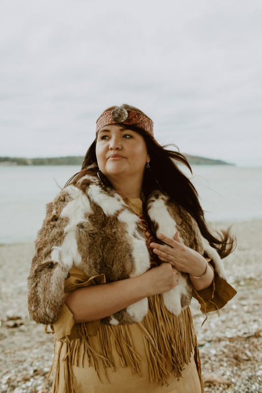 Because of the oppression of Indigenous female artistry, Brown infused her new fashion collection with the most gentle, tender feminine energy, inspired by northwest coast dance regalia.