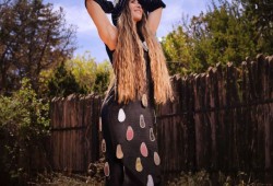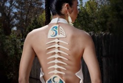 Brown made her collection through upcycling thrifted items with pieces from her Copper Canoe Woman jewelry collection and other newly created pieces. Other works were created from sketches which were sent to her friend Mary Meka, whose career is in dress making and design. Meka helped create Brown’s salmon dress, mussel dress and the salmon ghost dress.