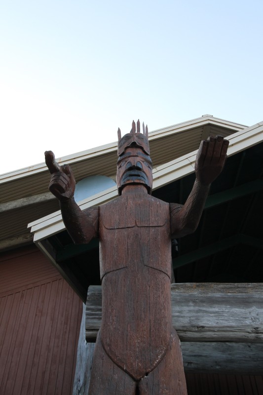 In front of the House of Huu-ay-aht stands carvings of Ho-mini-ki, the first woman, and Nutchkoa, the first man, copies ofgiant figures that once stood before a long house at Kiixʔin and are now at the lobby of the Royal B.C. Museum in Victoria.