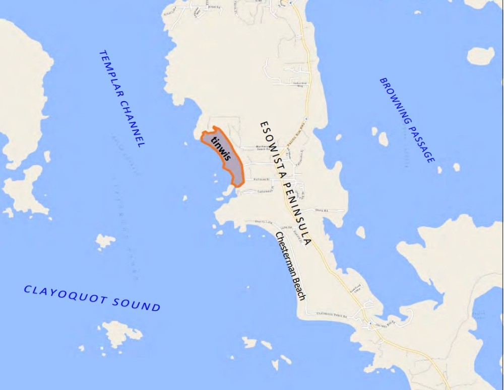 Located on the west side of the Esowista Peninsula in the District of Tofino boundaries, tinwis means “calming waters” or “calm beach” in the Tla-o-qui-aht language. It is the site of a Tla-o-qui-aht village and is also the site of Christie Indian Residential School after it moved from Meares Island in 1971. Christie was B.C.’s last residential school that shuttered in 1983.
