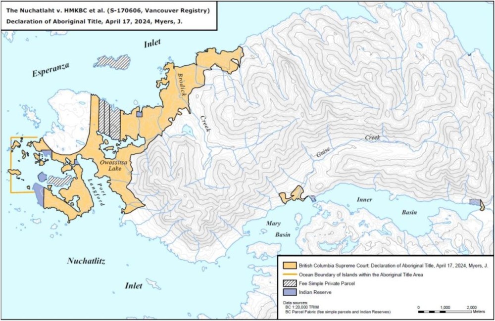 This current appearance seeks to build on Justice Elliott Myers’ ruling from April 2024. After nearly 60 days in court the judge determined that the Nuchatlaht are the rightful owners of a portion of the area they claimed, amounting to 12 square kilometres – most of which is on a strip along Nootka Island’s northwest coast that doesn’t extend more than a kilometre inland.