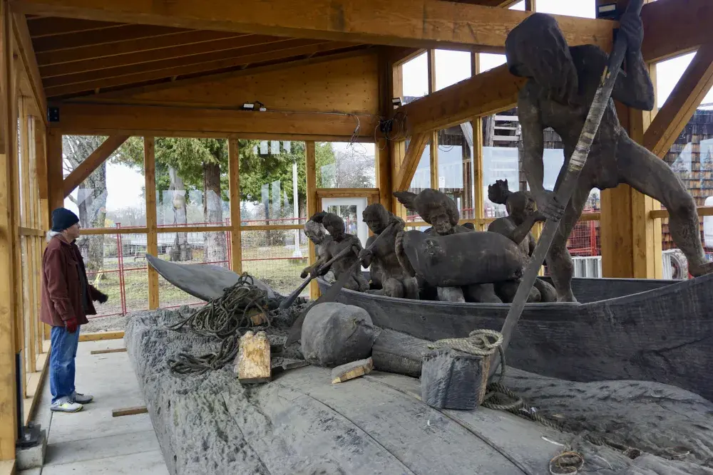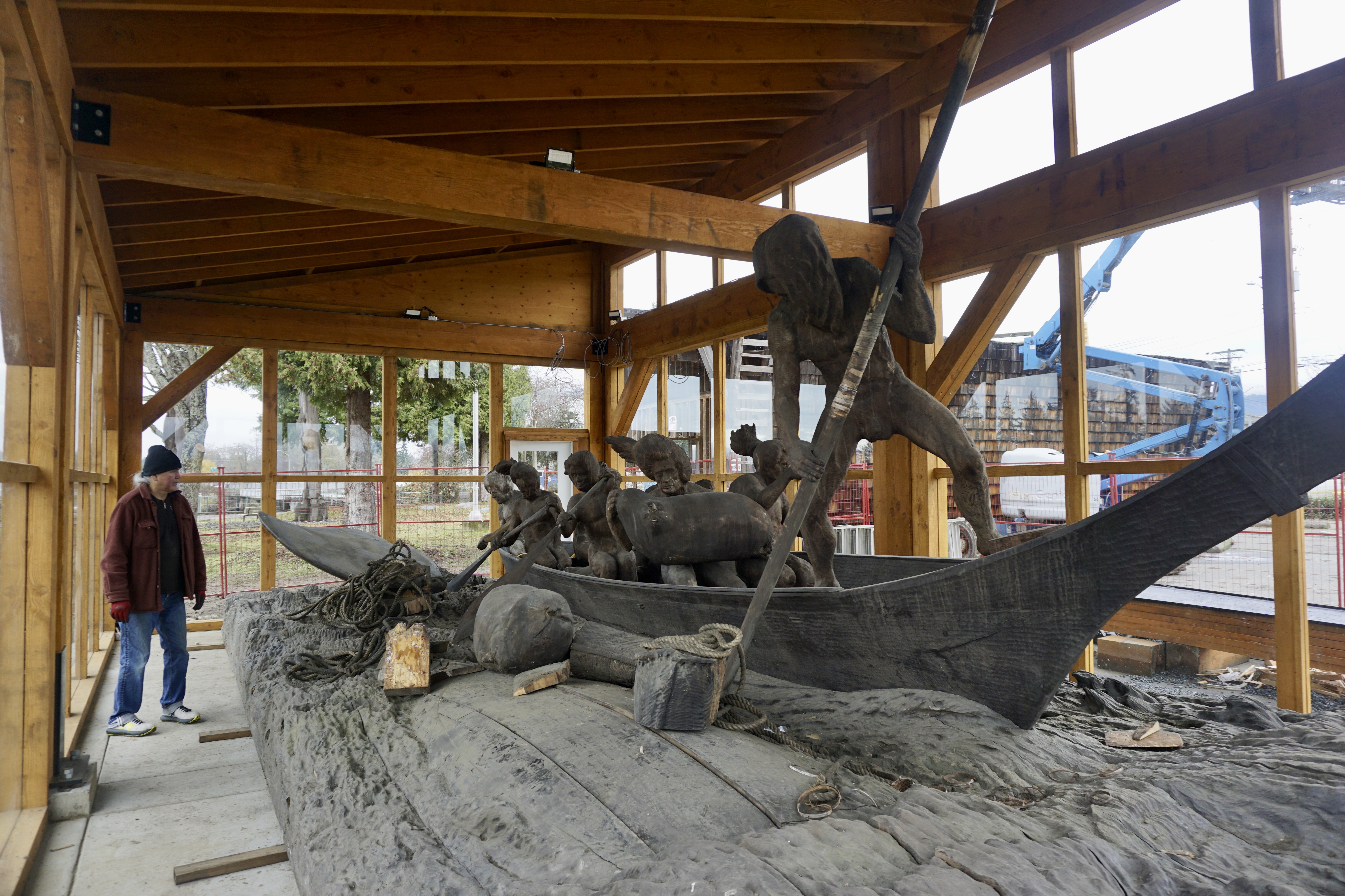 Artist Rodney Sayers from the Hupacasath First Nation, who carved the welcoming figures with Cecil Dawson, is tasked with putting the whaling monument back together after it was moved from the carving shed to its newly built home.