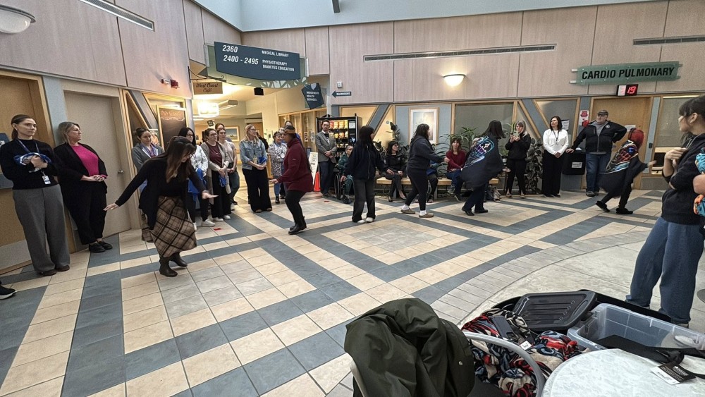 During a particularly challenging Christmas season, Tseshaht members gathered in the West Coast General’s atrium on Dec. 18 to recognize health care workers for their ongoing efforts. The First Nation sang and danced for the hospital staff, giving them Devil’s club necklaces for protection.