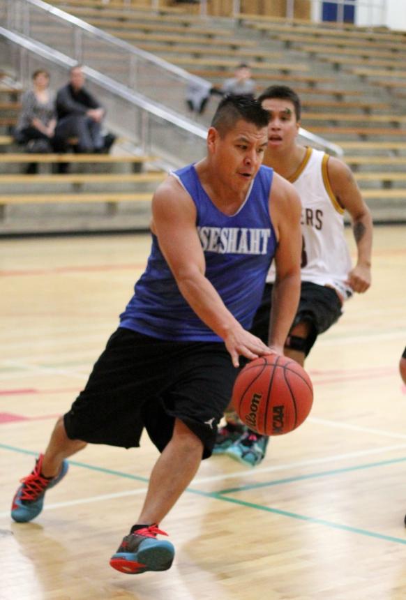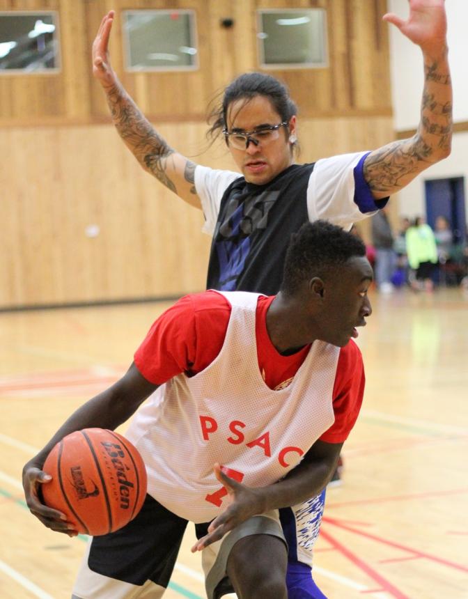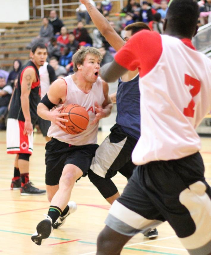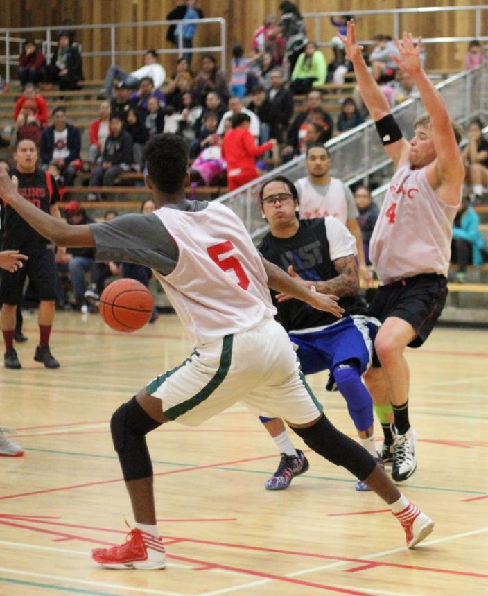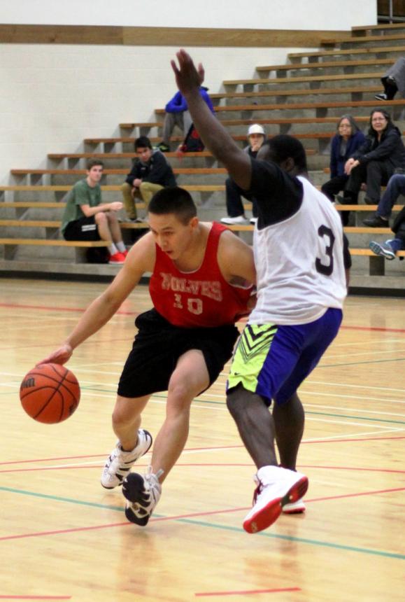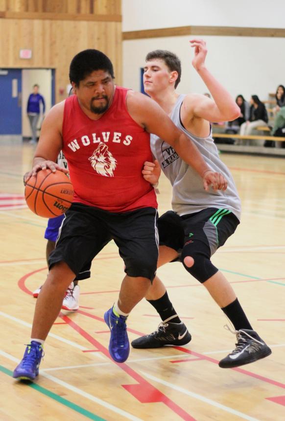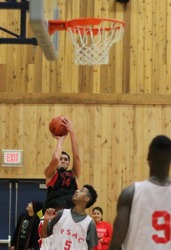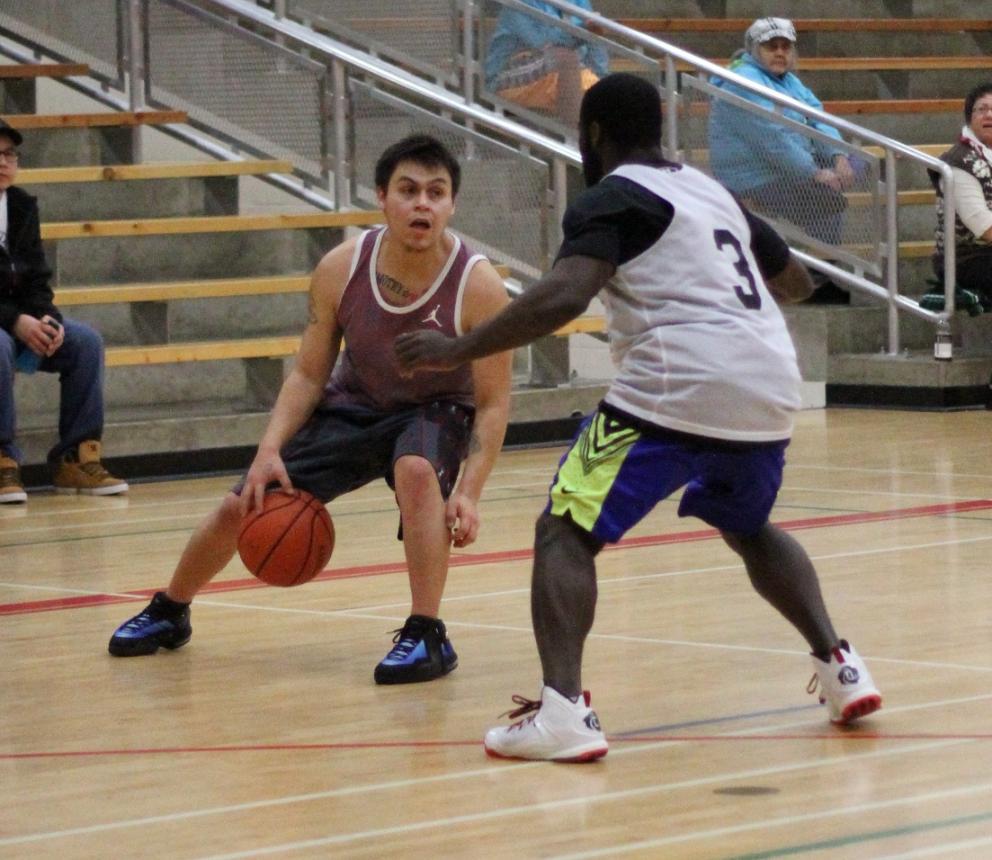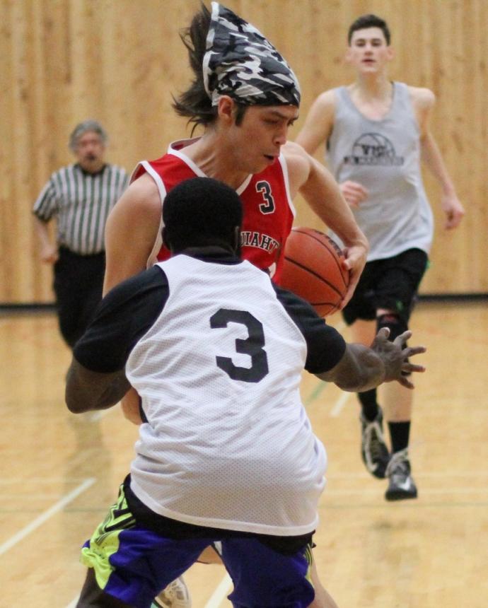 Wolves (red) vs Mulaqw; Stealerz 99 (grey) vs. Hawks 82 Saturday, Jan. 17 at Athletic Hall. All My Relations vs. Ballers white; Photos by Debora Steel
