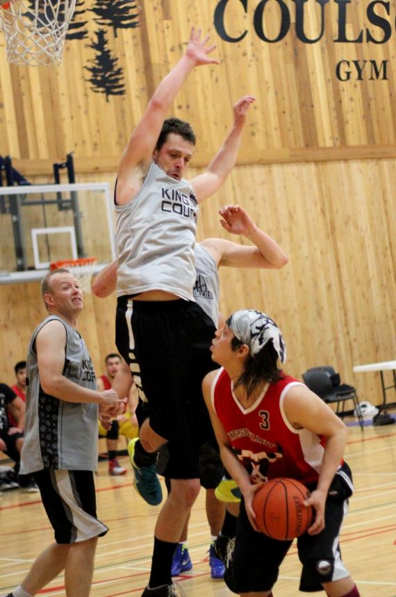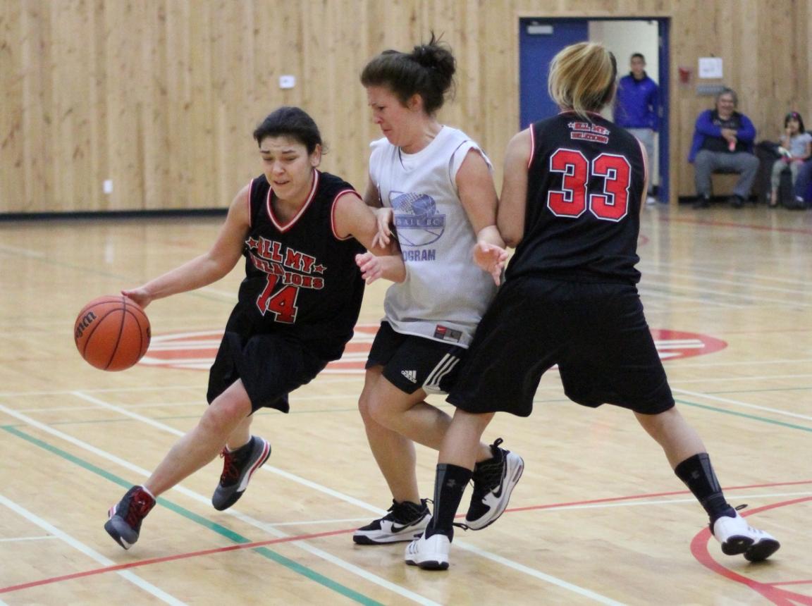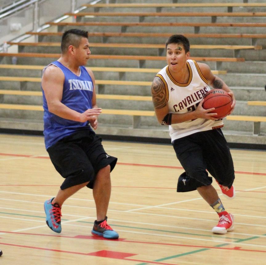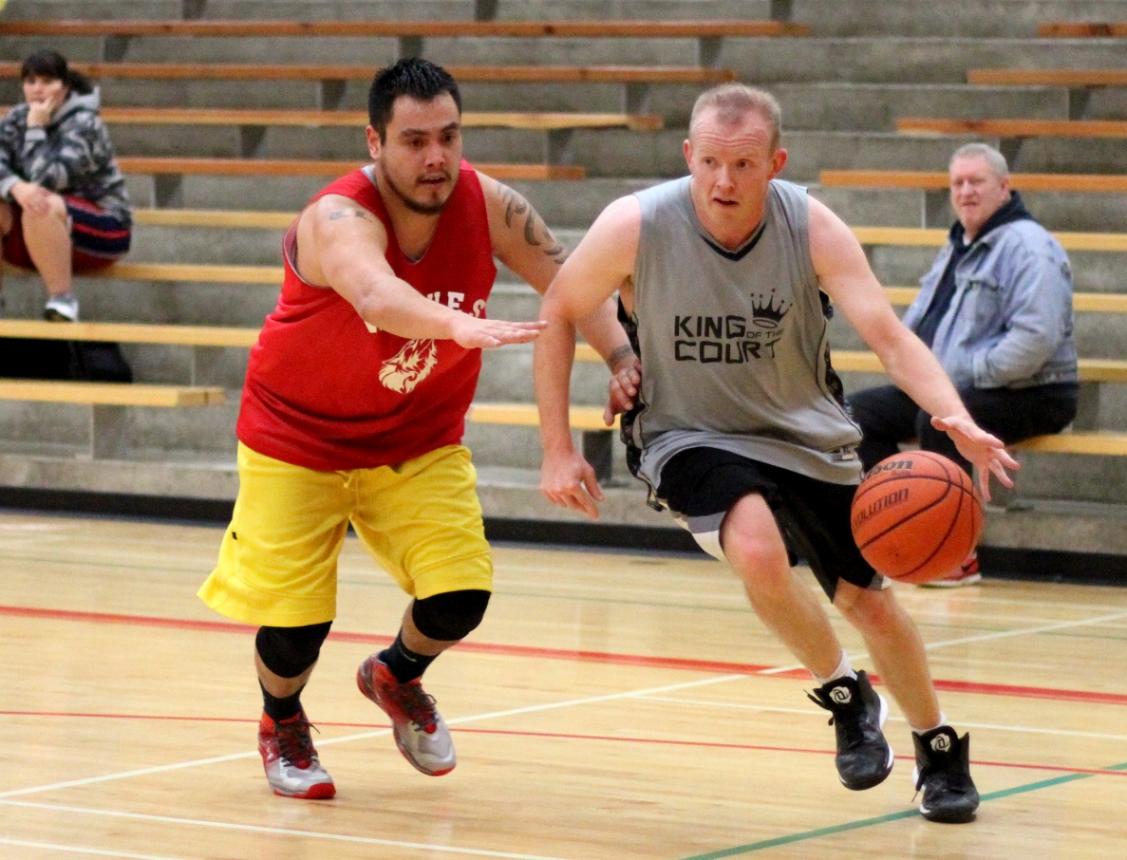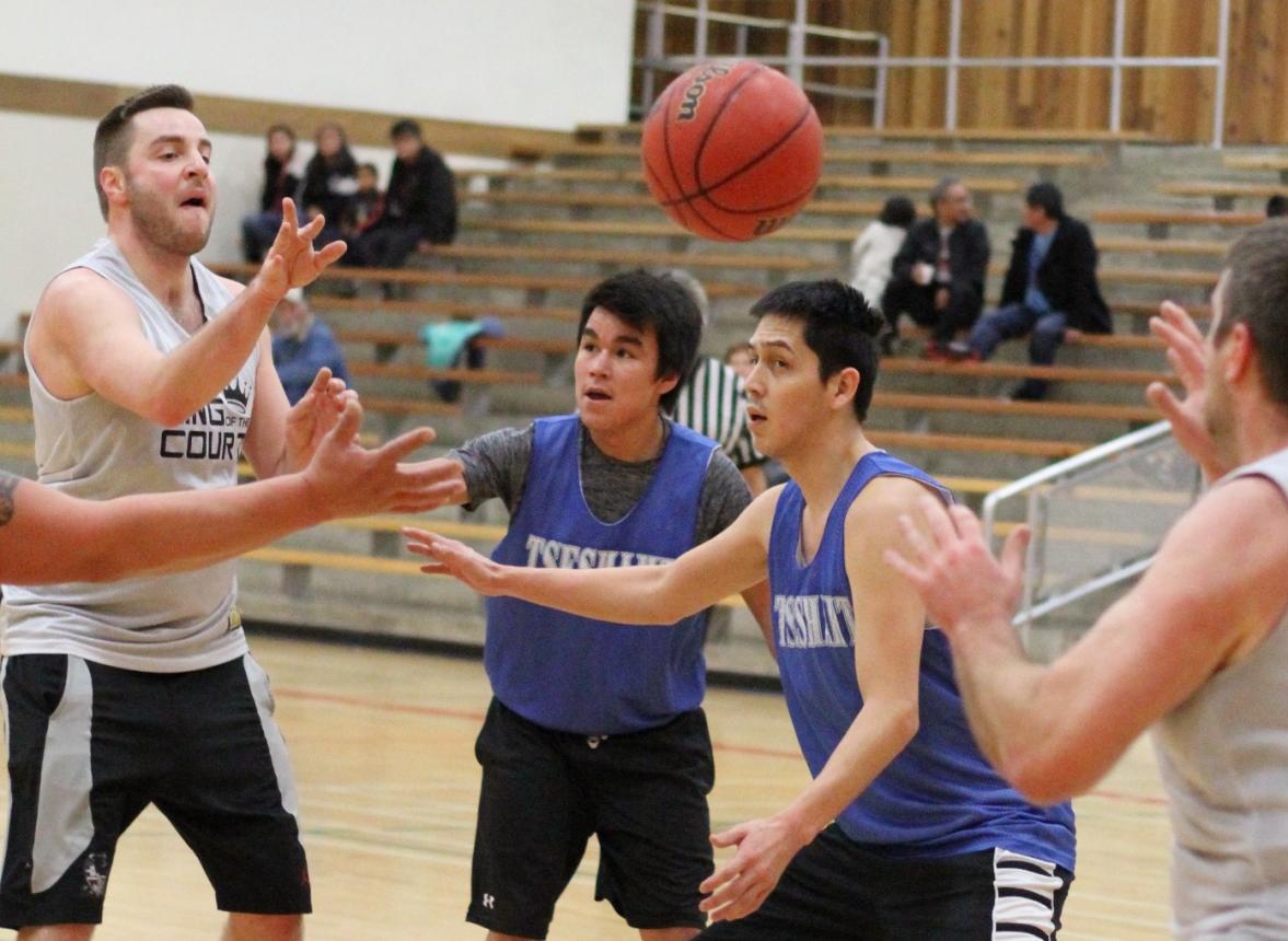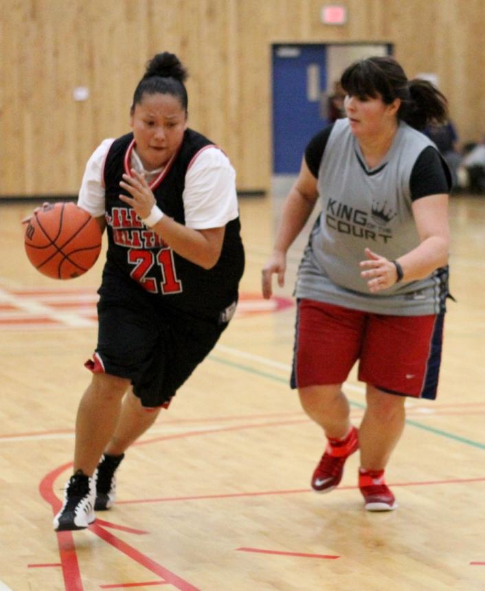 Wolves (red) vs Mulaqw; Stealerz 99 (grey) vs. Hawks 82 Saturday, Jan. 17 at Athletic Hall. All My Relations vs. Ballers white; Photos by Debora Steel