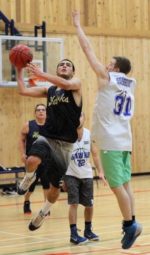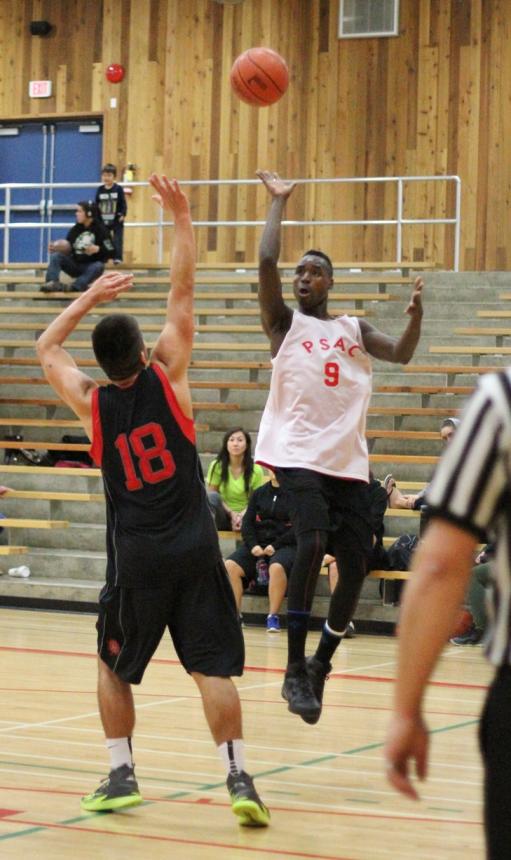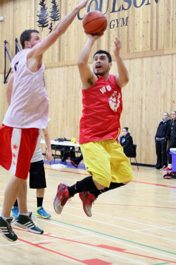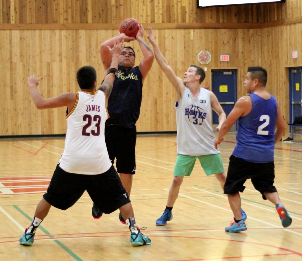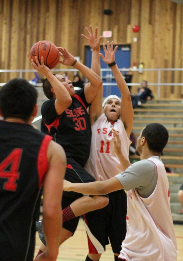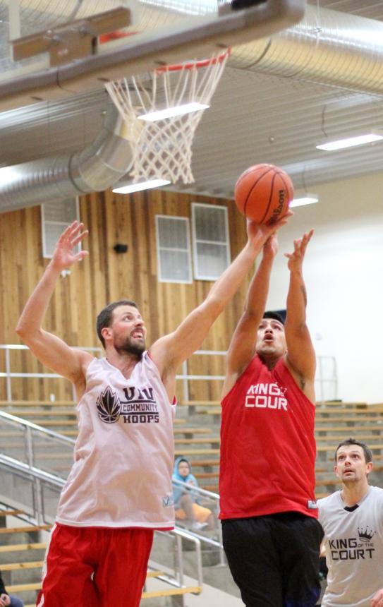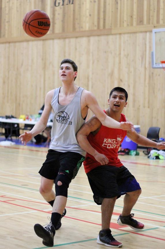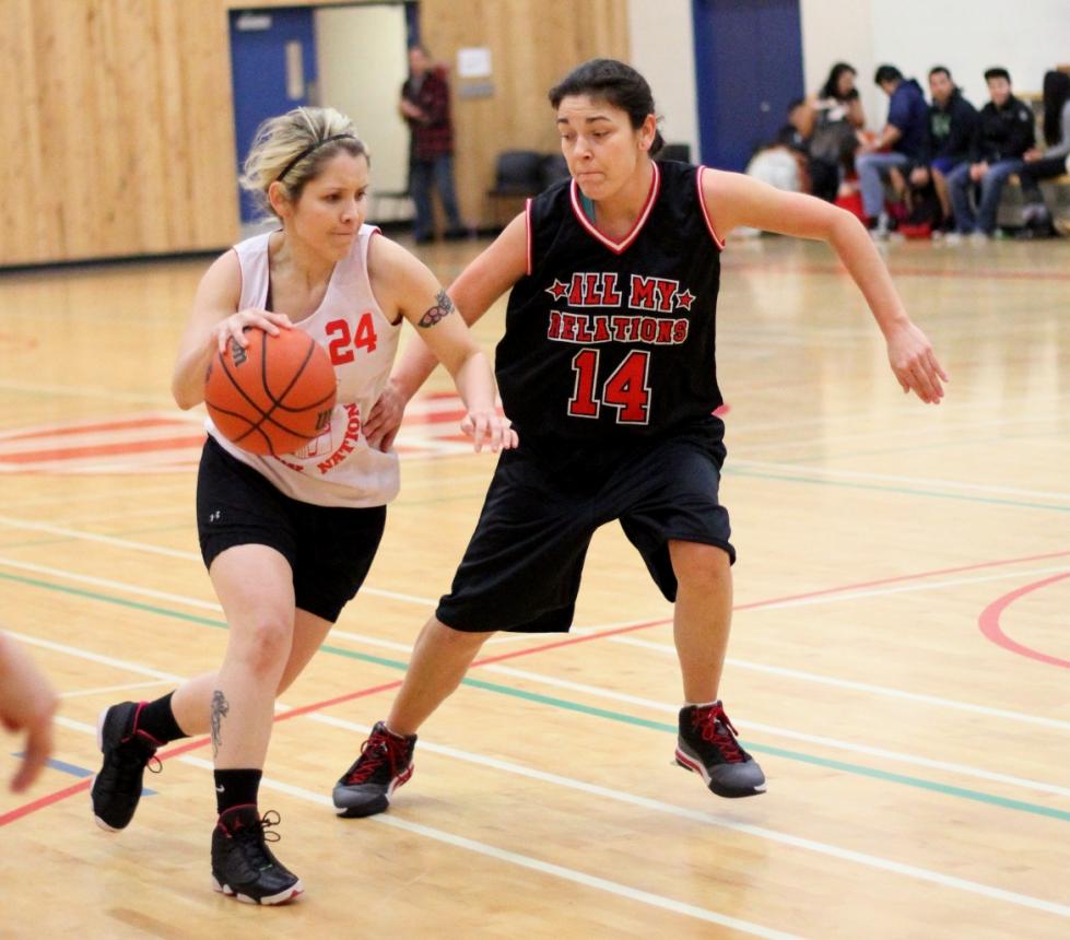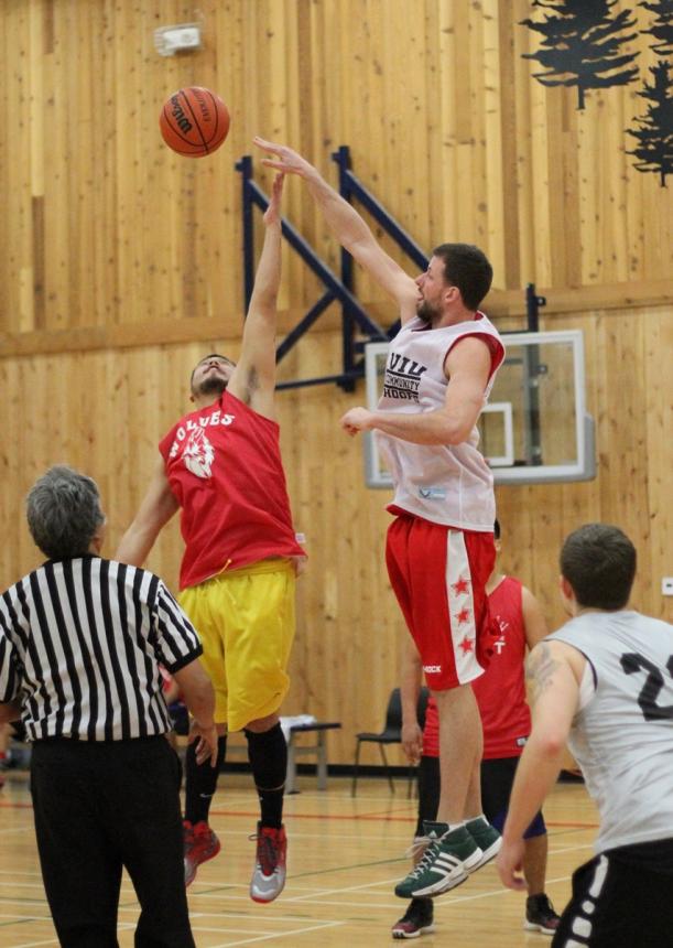 Wolves (red) vs Mulaqw; Stealerz 99 (grey) vs. Hawks 82 Saturday, Jan. 17 at Athletic Hall. All My Relations vs. Ballers white; Photos by Debora Steel