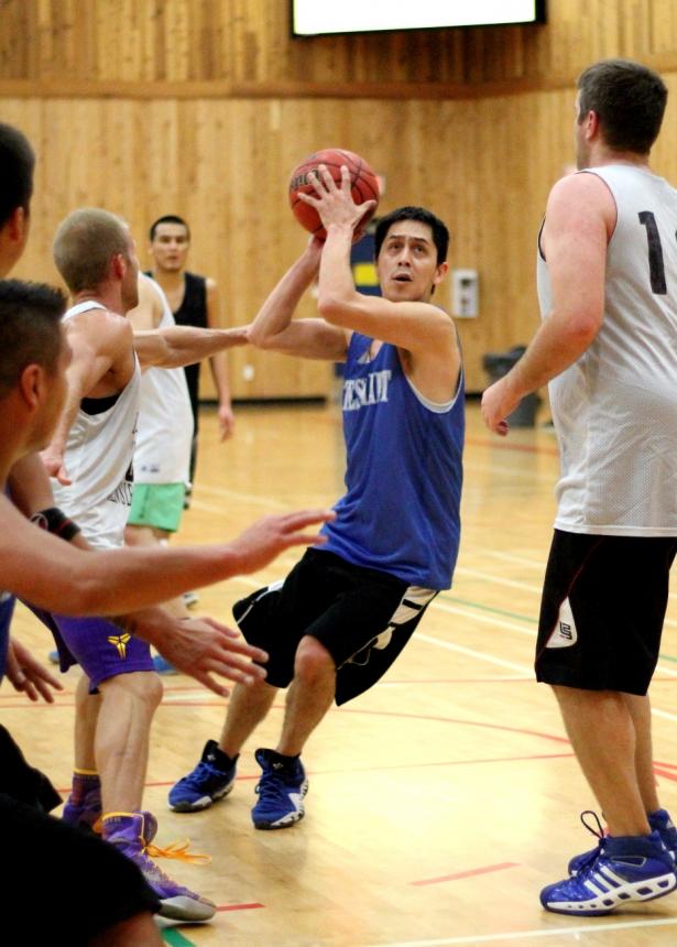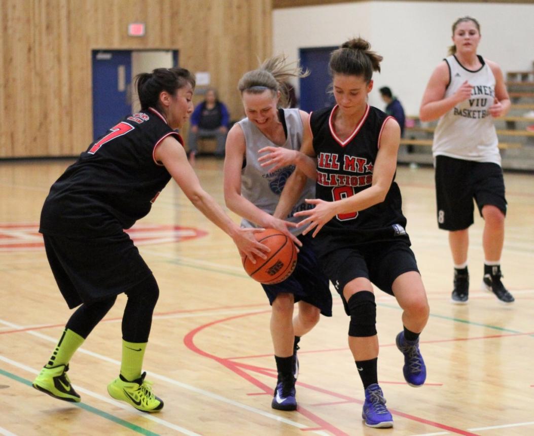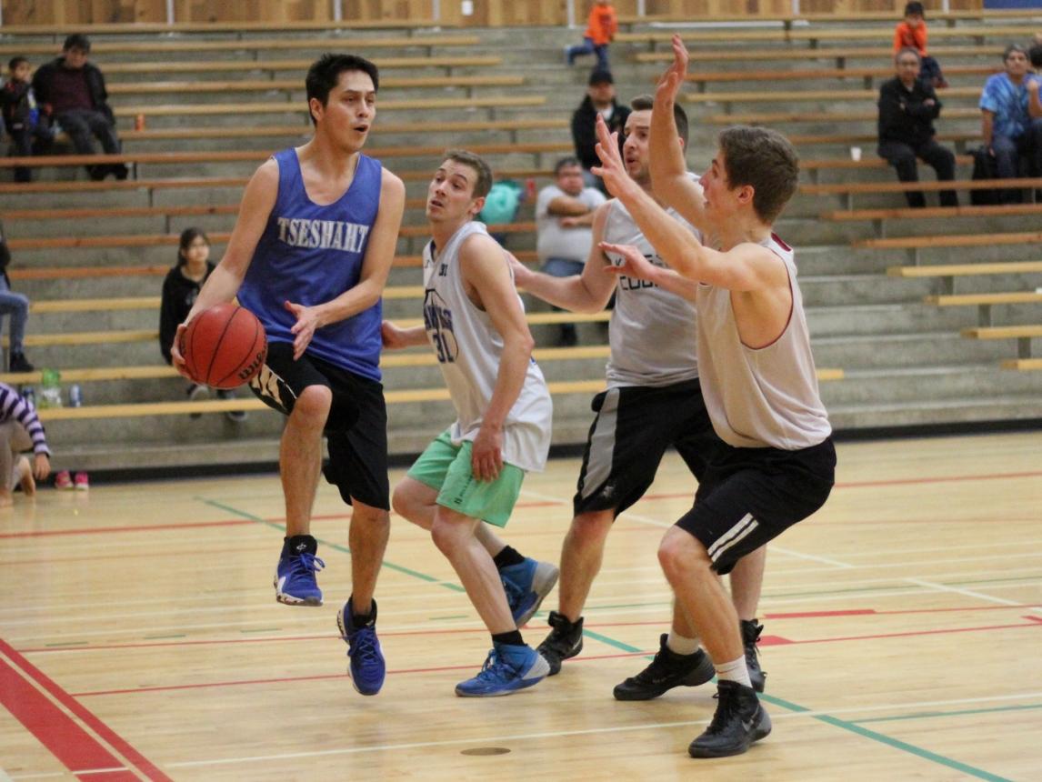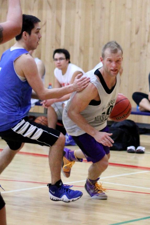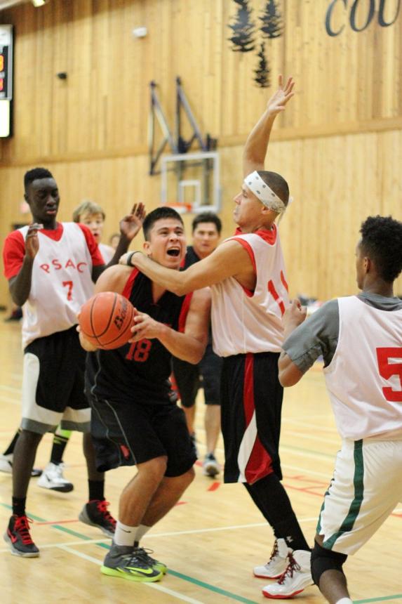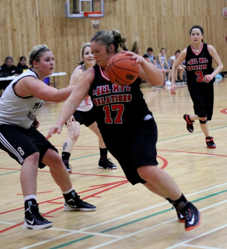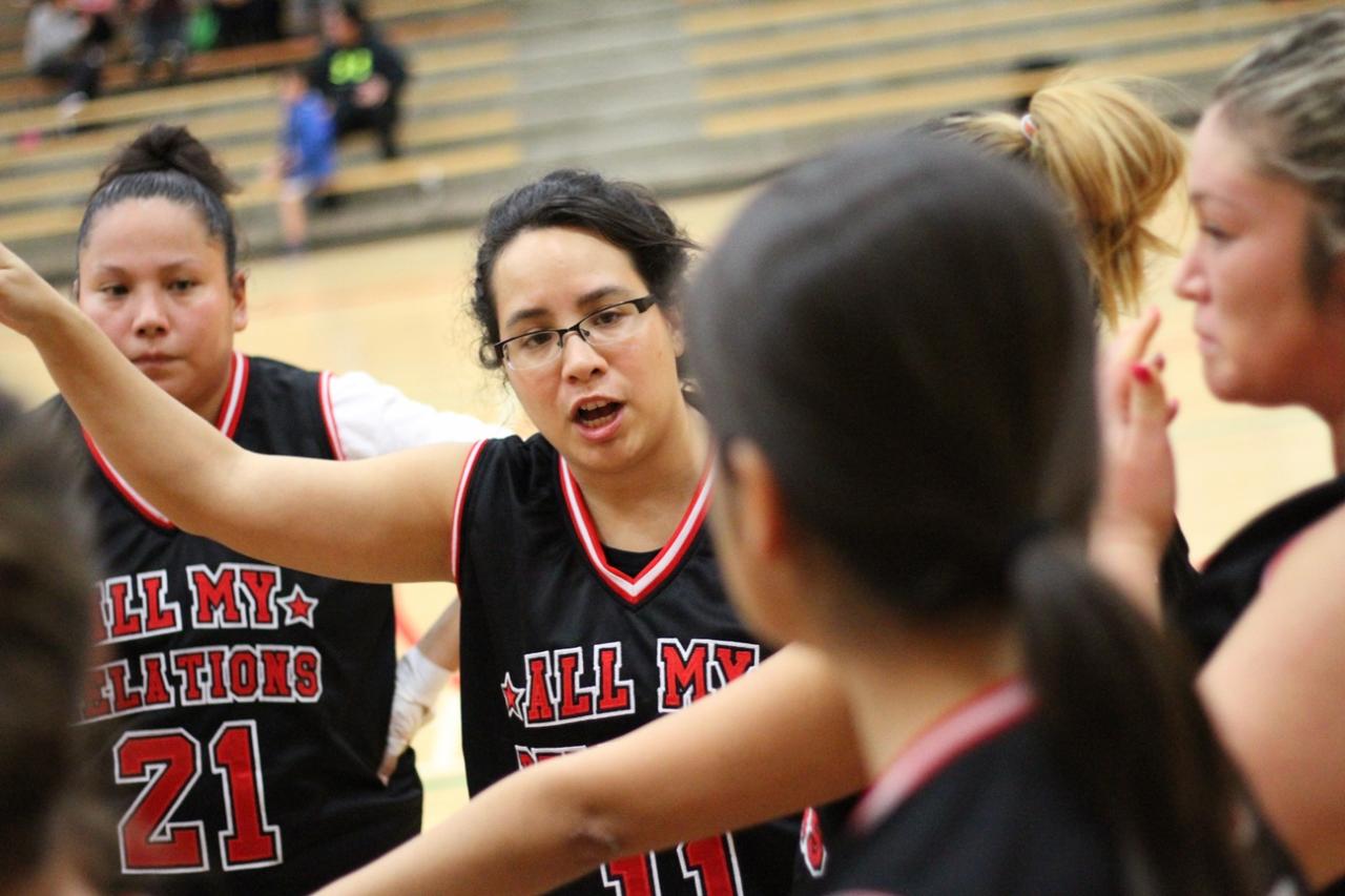 Wolves (red) vs Mulaqw; Stealerz 99 (grey) vs. Hawks 82 Saturday, Jan. 17 at Athletic Hall. All My Relations vs. Ballers white; Photos by Debora Steel