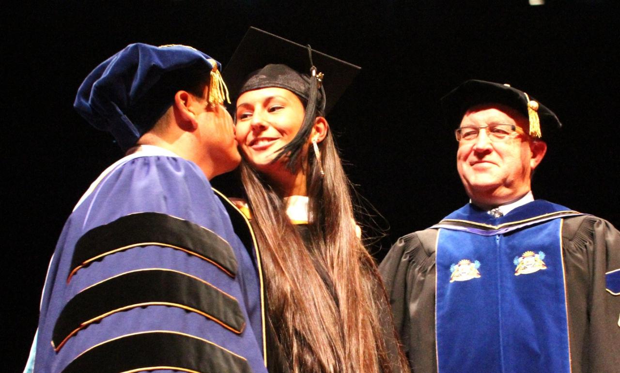 The chancellor said he hoped the audience didn’t mind if he spoke briefly about one of the graduates. He talked about the effort it takes to reach graduation and acknowledged the support Tara had during her years in school, when she needed encouragement, or a shoulder to cry on, or an ear to bend; even the odd money transfer, he said with a laugh.