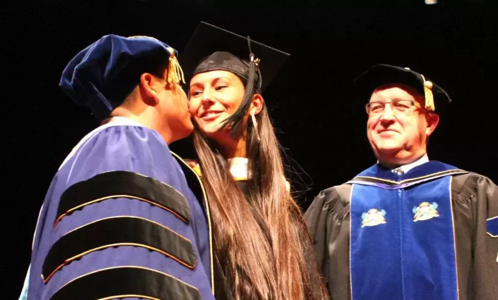 Tara Dawn Atleo has graduated from Vancouver Island University with a Bachelor’s degree in Business Administration with a focus on Sustainable Economics. Convocation took place this afternoon, and A-in-chut, VIU Chancellor, had the happy duty of greeting each of the graduates as they crossed the stage to collect their hard earned honors.