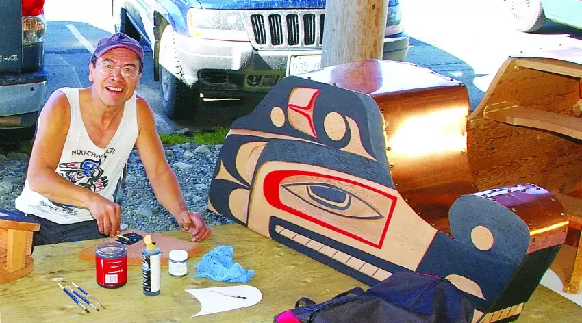 Hesquiaht artists Patrick Amos and Willie (Buddy) George have been working on site in the carving shed across the parking lot from the lobby. They’ve carved massive serpent headdresses adorned with copper that will be placed atop the cedar pillars at the entrance to the lobby.