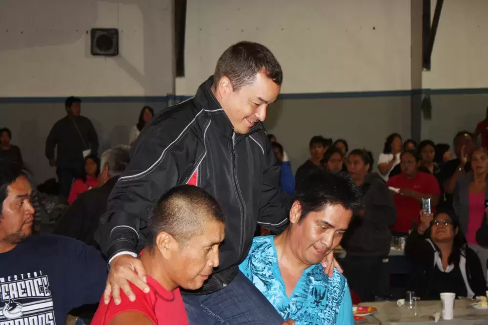A-in-chut was carried into the room on the shoulders of Ahousaht men. The men sang a victory song while everyone else cheered.