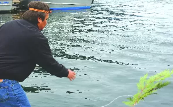 After a few songs were sung, and prayer chants performed, the canoe came out and spread sacred cedar boughs on the water. Community members then gathered for a luncheon, and talked about how much Tsu’xiit meant to them.