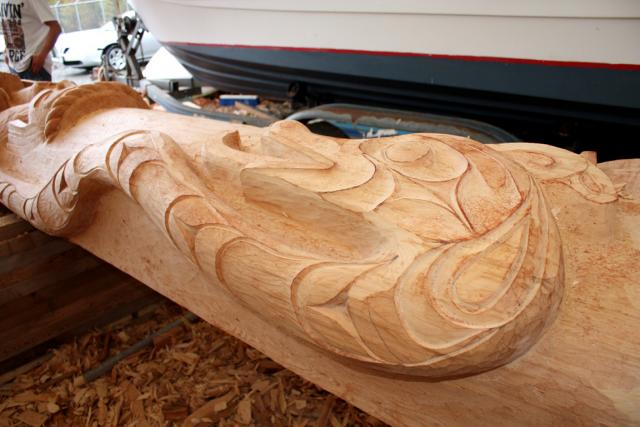 All of the carving is complete and the pole is resting in a shed at Ty-histanis. The artists are waiting for dry weather to paint the pole and mount the sun rays.
