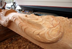 “The crests are from houses from all up and down the coast, all Nuu-chah-nulth nations,” Joe said. At the base of the pole is a bear holding a salmon followed by a wolf, a human, a pair of serpents and all topped off with the sun.
