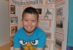 Howie Little, nine, chose the topic of Nuu-chah-nulth animals, and he is able to recite the names of both the familiar, such as the cougar and the salmon, as well as spirit figures such as the Sea Serpent and Thunderbird.