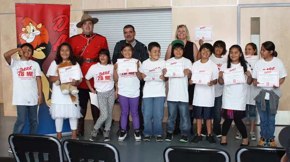 Members of the Royal Canadian Mounted Police arrived at Maaqtusiis School May 30 to celebrate with 12 Grade 5 students who successfully completed the DARE Program.