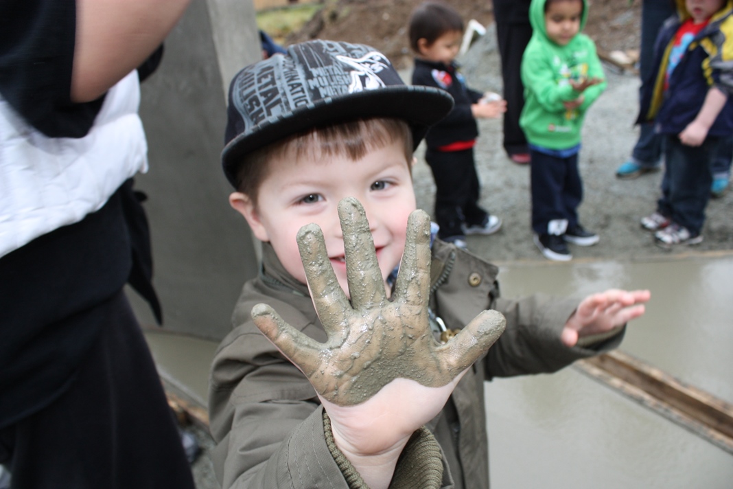 Artist Connie Watts invited the children from Tseshaht's t'aatnee?is Daycare to leave their marks on the piece of art. They were asked to leave hand prints or draw a little design in the wet concrete.