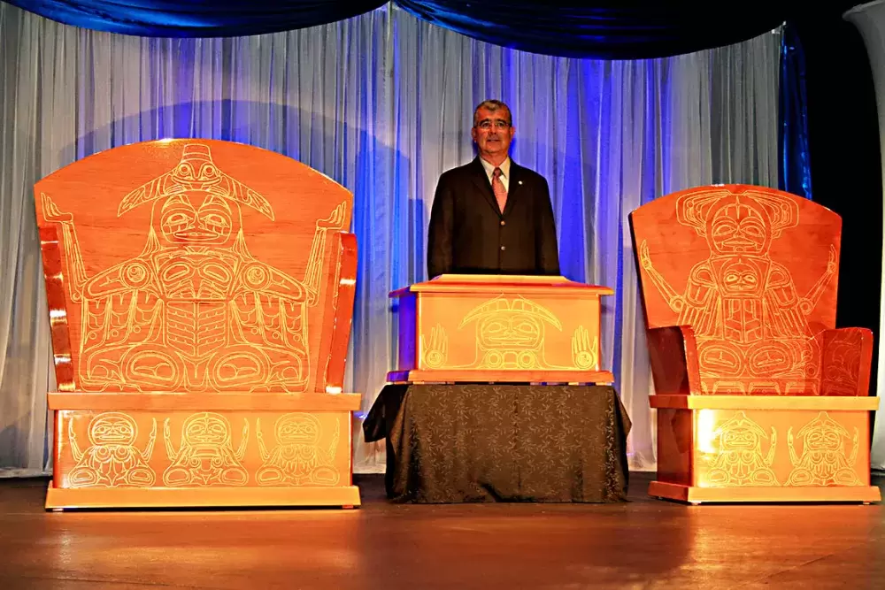 Dr. Ralph Nilson removed curls of shaved cedar from his suit pocket and placed them on the podium. They were collected during visits to the carving shed of Arthur Vickers, without the artist’s knowledge, Nilson joked. They normally sit in a bowl on his desk at Vancouver Island University; an attachment to the reclaimed old growth cedar Vickers used to create a convocation suite, with 24-karat gold leaf designs, for the graduates of the school. A masterpiece, said the VIU president, which will inspire for generations.