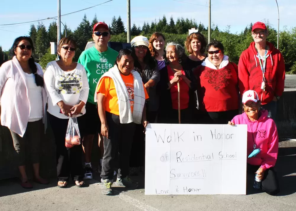 About half a dozen residential school survivors took part in a walk on June 23 to raise awareness about the residential school system and its legacy and to honor other survivors. They started on Highway 4 at the Tofino highway junction and walked nearly 20 km to their Esowista home, where they had lunch on the beautiful beach.