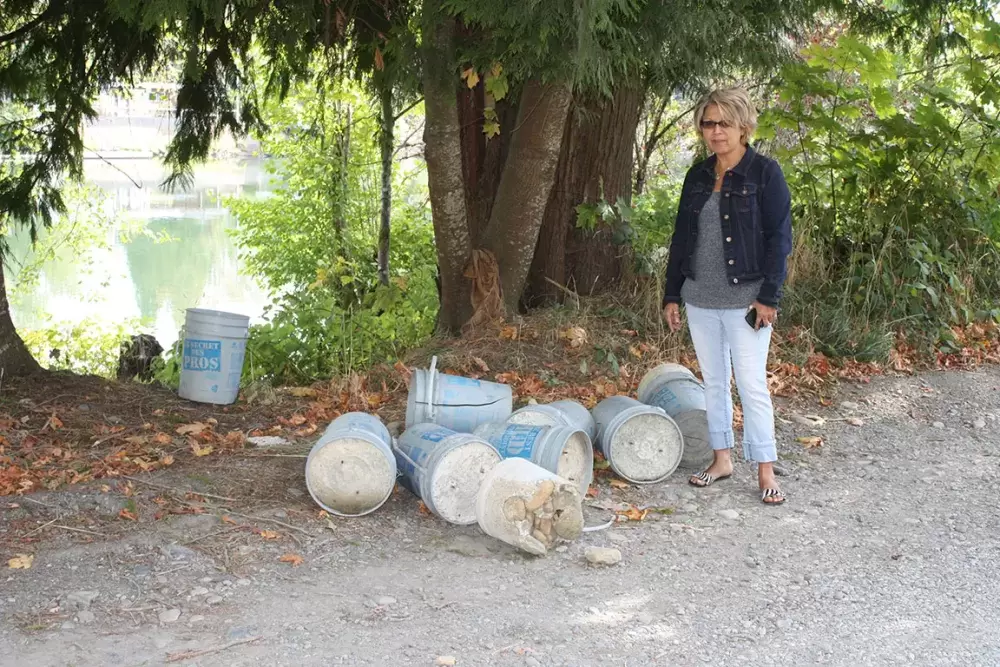 On Aug. 25 Tseshaht public works staff discovered nine heavy pails filled with rocks and cement. The grey five gallon pails were sold as containers for drywall compound called Best Mud in the Joint. Each pail was filled with rocks which were cemented in and flattened on the top. Two bolts protrude from the cement and appear to have served as an anchor for round posts.