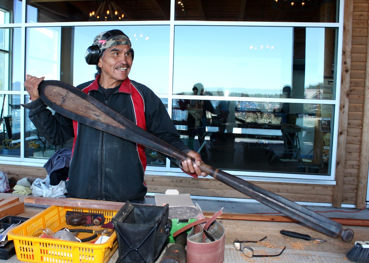 Tla-o-qui-aht canoe maker Carl Martin has been teaching people how to make full-sized canoe paddles from yew wood. He had on display a 40-year-old yew wood paddle that he made as a young man.