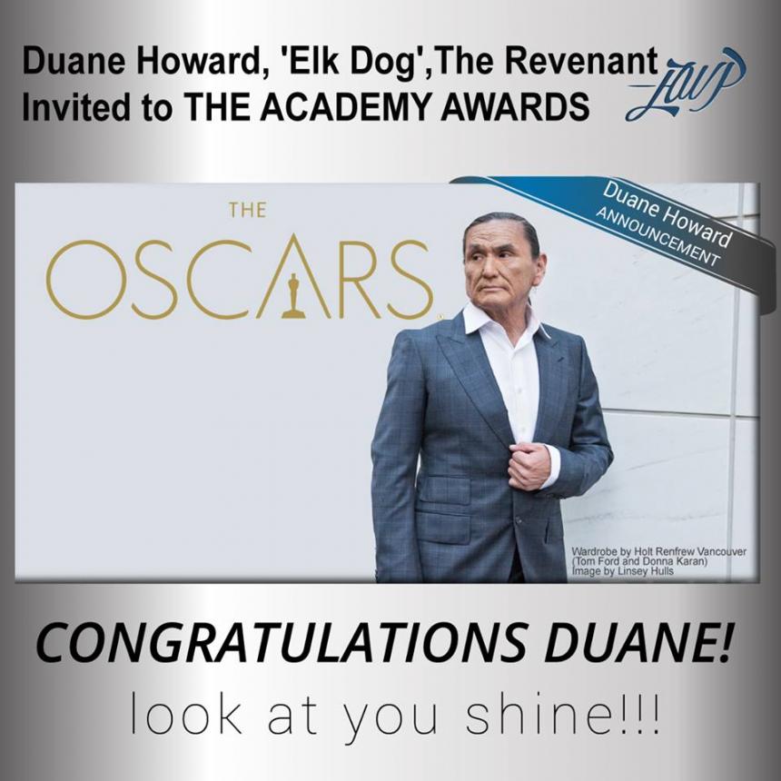 His publicist shared the news on social media: “Very exciting news today! Duane E Howard was invited to The Academy Awards to join in support of The Revenant.”