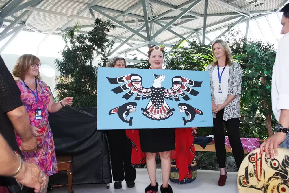 Burn arrived at the hospital with a large delegation from Ditidaht on May 30. She was there to retrieve her painting and hospital directors were there to greet her. The people from Ditidaht, including all the children from the community school, danced into the hospital foyer, leading the way for Burn, and her family members.