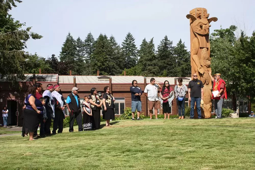 Invited guests were seated in front of the totem pole on the morning of the celebration. The refurbished pole had already been raised but had blankets covering the sacred SXweXwe mask at the top of the pole.