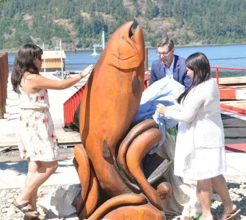 The guests then shifted to the Centennial Pier entrance, where Cynthia Dick and Hupacasath communications director Jolleen Dick unveiled a carving by Vancouver artist Jesse Toso, mirroring his rising salmon carving at the other end of the strip on Harbour Quay.