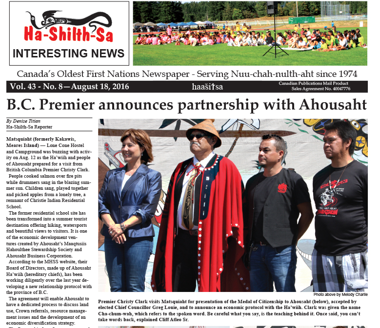 Ha-Shilth-Sa is Canada's Oldest First Nations Newspaper. It began publishing on Jan. 24, 1974. Ha-Shilth-Sa is published by the Nuu-chah-nulth Tribal Council, a non-profit society serving members of the Nuu-chah-nulth First Nations located along the west coast of Vancouver Island. Ha-Shilth-Sa is a Nuu-chah-nulth phrase meaning "Interesting News." It can be found online at www.hashilthsa.comHa-Shilth-Sa is published each month in hard copy. It is distributed to Nuu-chah-nulth members on Vancouver Island, in Vancouver, or wherever they may live. The newspaper is also sent to each First Nation in British Columbia, as well as other individuals, businesses, institutions, organizations, government and agencies in Canada and the United States interested in First Nations issues, concerns and culture.