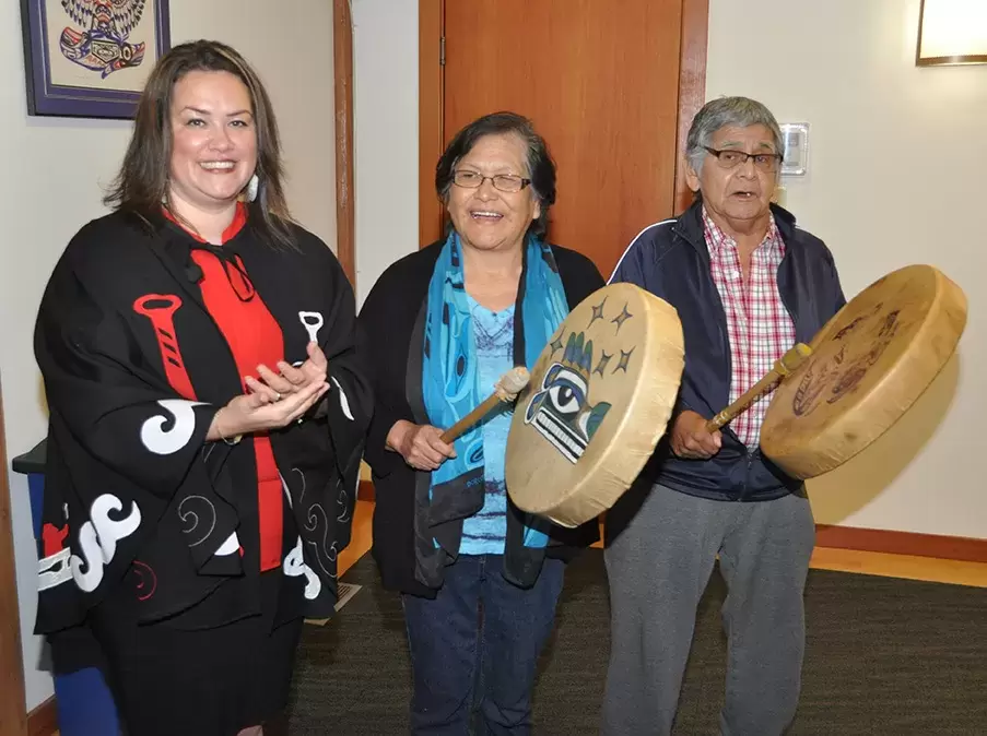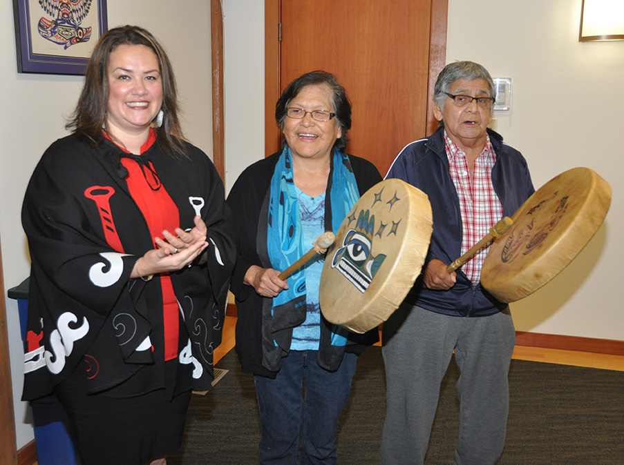 Speaking in Nuu-chah-nulth and English, Ahousaht elder statesman Cliff Atleo Sr. welcomed guests and thanked Tseshaht First Nation for allowing the celebration in their traditional territory. He also introduced Ray and Marie Samuel, who performed the Dinner Song.