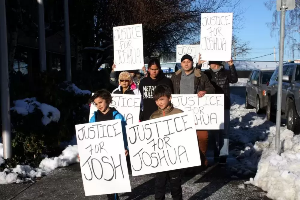 The family had planned a walk to the Campbell River Courthouse, but walking was unsafe due to the accumulation of snow. Instead, they drove to the courthouse and carried placards demanding Justice for Joshua to the front of the courthouse. Some cars honked in support as they drove past the busy intersection