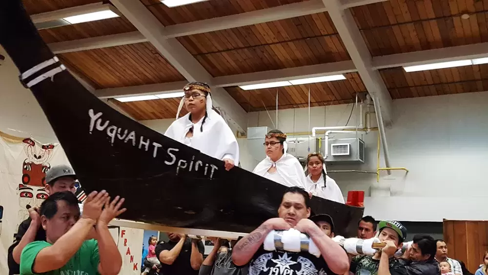 The chupitz, made in Tla-o-qui-aht years before and carried to Mowachaht/Muchlaht as a gift, came full circle, now carrying the young ladies in a celebration of transformation and the name of Kayleigh and Jaden’s paternal grandmother’s birth community, Yuquaht Spirit.