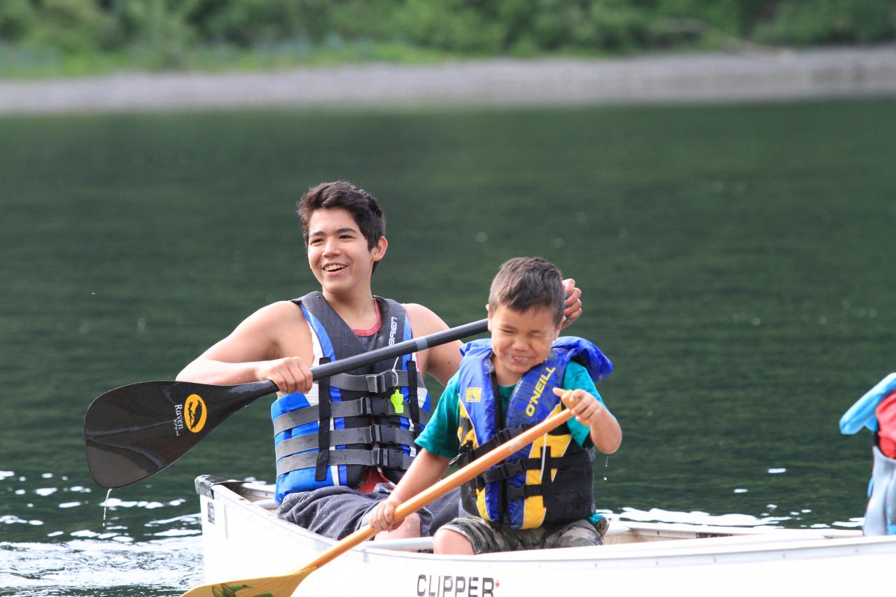 The youngsters paddle alone in canoes, doing six laps around fish pens on the calm morning water of Nitnaht Lake.