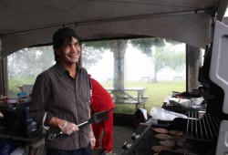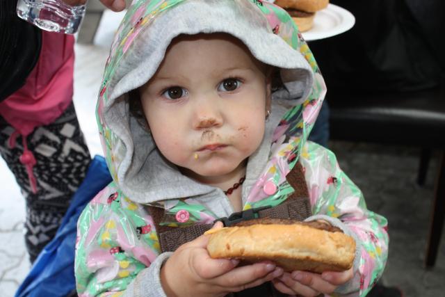 The food prep area was sheltered from the rain under a gazebo. People lined up to fill their plates then moved to the eaves of nearby buildings or canopied picnic tables.