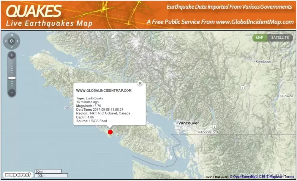 A small earthquake rattled the west coast of Vancouver Island Tuesday morning. The United States Geological Survey (USGS) website reports that the 3.8 magnitude quake struck 14 kilometres north of Ucluelet at a depth of 4.9 kilometres at 9:08 a.m.PDST on Sept. 5.