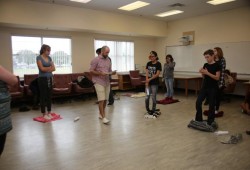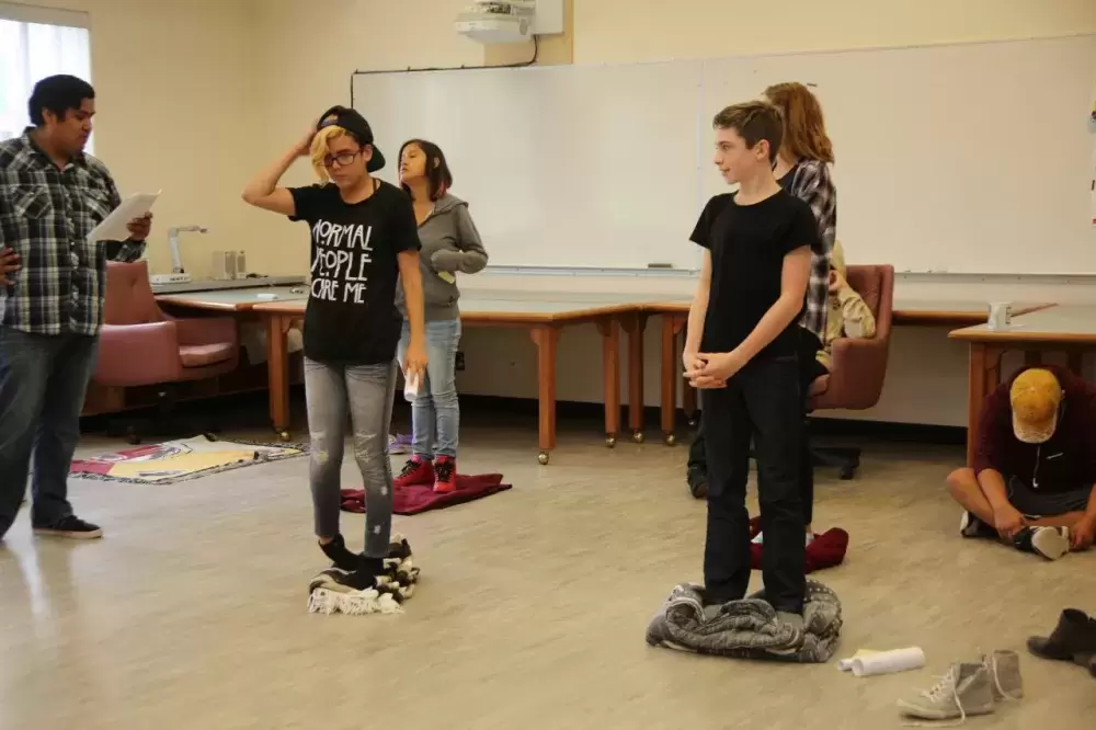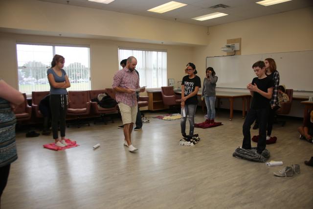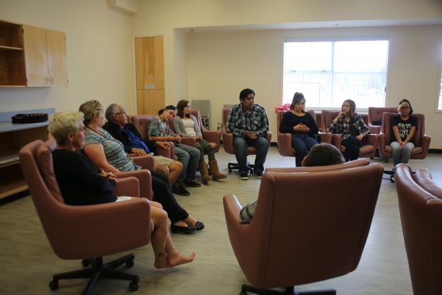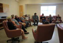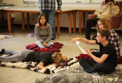 Students at the Eighth Avenue Learning Centre participated in the KAIROS Blanket Exercise on Wednesday, Sept. 27, which illustrates how Europeans affected First Nations lands over the last two centuries. At the start of the interactive exercise blankets were fully spread across the floor, then were progressively folded up to become smaller and more separated, like reserves. At the end of the exercise students discussed its significance with Samuel, teacher Keith Holm and Ahousaht elder Cliff Atleo. (Holly Stocking photos)