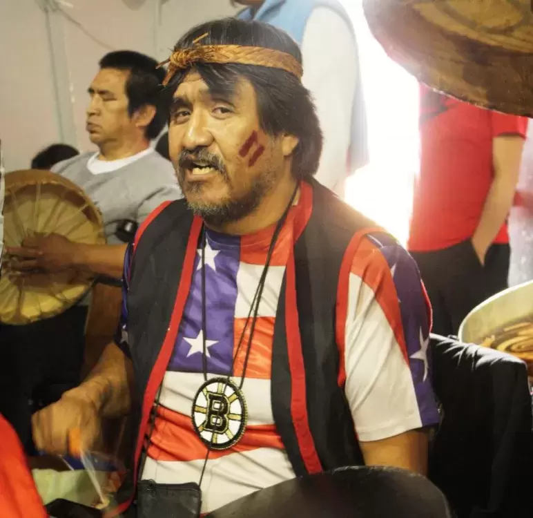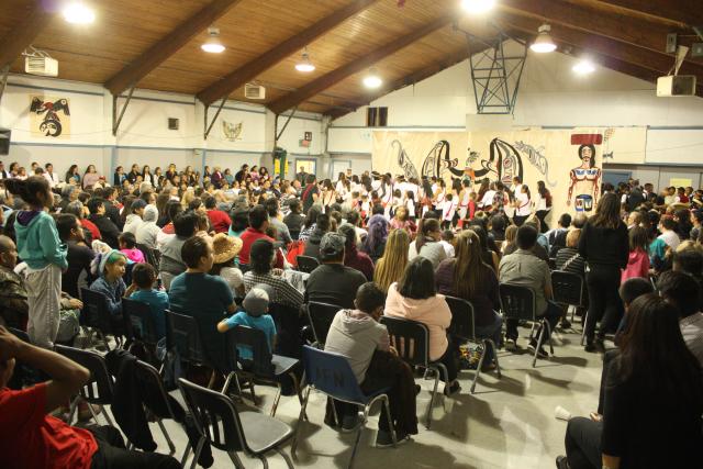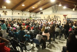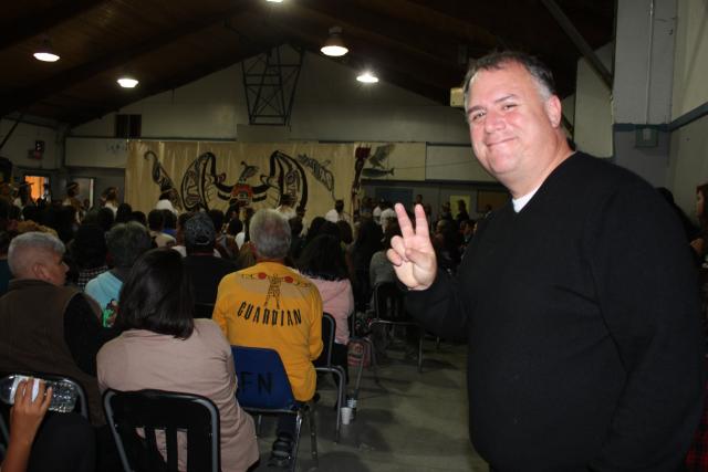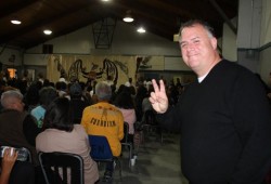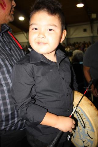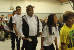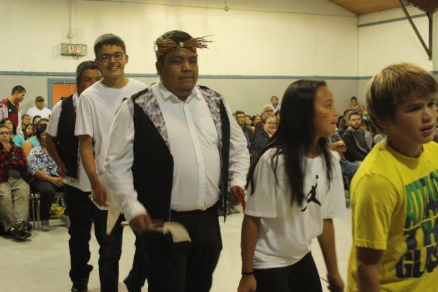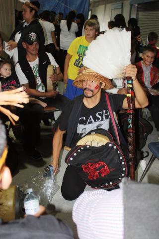 The event started at 10 a.m. with a packed house as people were seated in the old traditional style of women on one side of the hall and men on the other. Elder John Hudson Webster stood in front of the Swan ceremonial curtain to perform a prayer chant. Hosts Luke and Melinda Swan and their three adult children stood with Webster to welcome their guests.