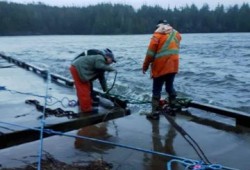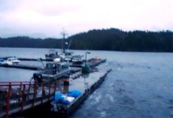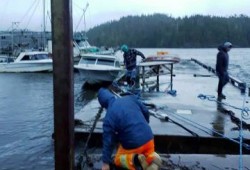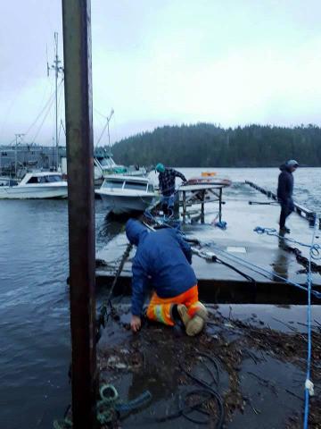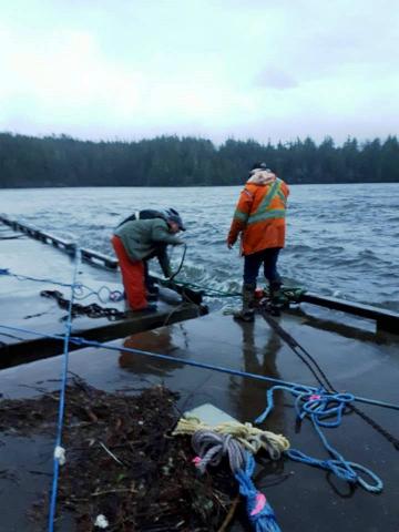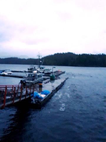 According to resident Cecil Sabbas, more than a dozen Hesquiaht members answered the call for help when they found that two fingers had broken away from the main float. “One finger drifted about 20 to 40 feet out with the boats still attached,” he said. They had to board boats and head out to the two the floats to return them while the storm was still raging.