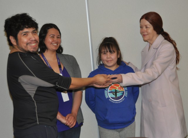 Agnes further presented Quu’asa support worker Maureen Knighton with a gift of appreciation, for her continuing support for the Keitlah family.