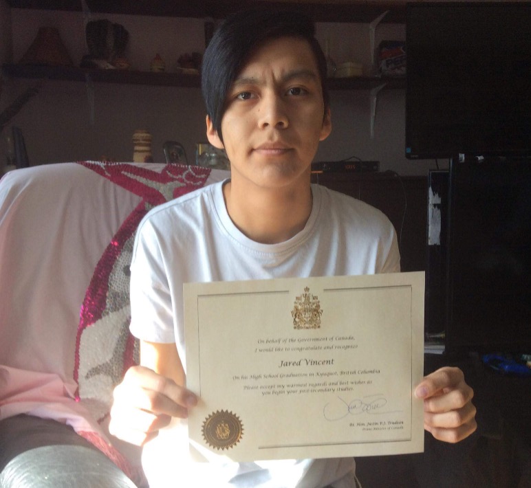 “On behalf of the Government of Canada, I would like to congratulate and recognize, Jared Vincent, on his high school graduation in Kyuquot, British Columbia. Please accept my warmest wishes as you begin your post-secondary studies.” Trudeau’s signature is at the bottom of the page.