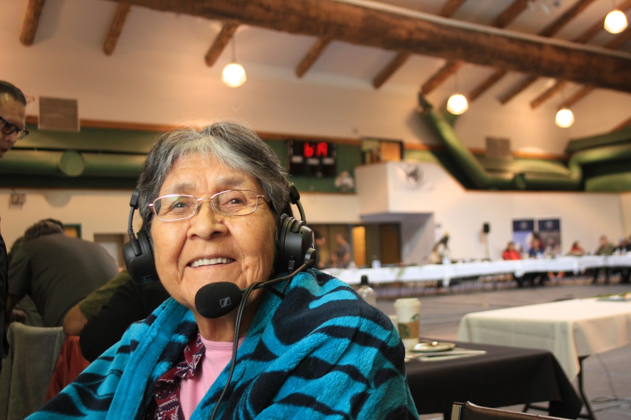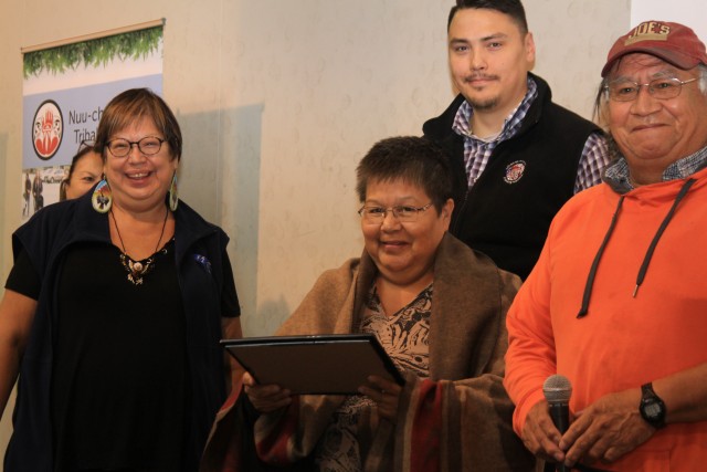 As she worked translating from Nuu-chah-nulth dialects, Helen Dick rose from her table at the tribal council’s annual general meeting to receive recognition. Wrapped in a blanket after being reminded of her generations of service to her community, the Tseshaht member spoke first in Nuu-chah-nulth, then English when handed the microphone.