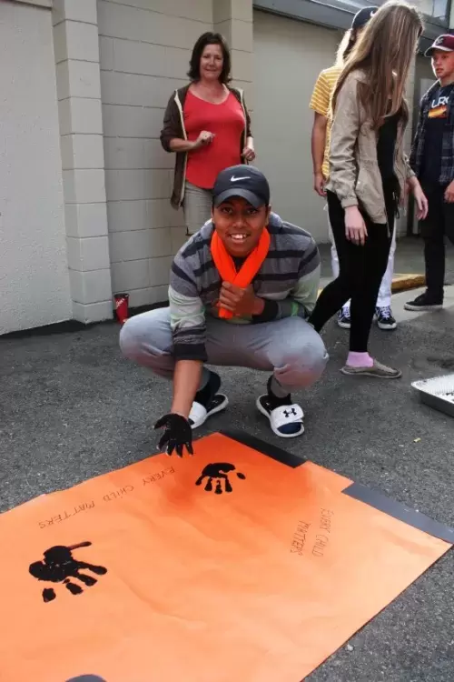Samuel said this is the third year he’s organized activities for students and staff to raise awareness of the legacy of Canada’s Indian residential schools. Each year he holds class discussions followed by the creation of a commemorative banner that is usually put on display in Port Alberni. His students are Grade 9-10 Alternative Education students, some of whom are Nuu-chah-nulth and have direct knowledge of the legacy of Indian residential schools.
