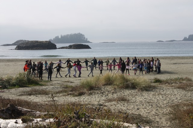 The afternoon was filled with activities for the kids with a lahal game being played outside, a fun game that involved counting in Nuu-chah-nulth on the beach and kids playing a large wooden drum that many of them had a hand in carving.