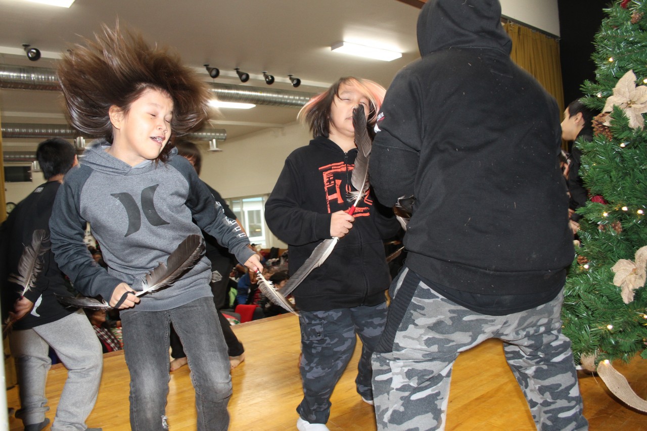 Logan noted that the issue was relatable to many at the school, as some students commented that their parents had struggled with homelessness. The students’ handiwork was also visible at the Dec. 10 event as some ladies wore handcrafted cedar boughs and roses, and they gave spirited performances of the Tseshaht Dinner Song and Kwii Kaaltha (Victory Song) before the meal was served.