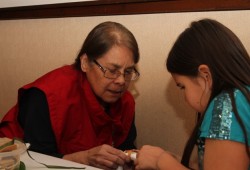 The Victoria Edelweiss Club was filled with over 100 for the gathering, with service providers such as the First Nations Health Authority and NTC nursing lining the edge of the room with information booths. Participants enjoyed a hot meal, traditional songs and some stories about Nuu-chah-nulth origins.