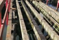 Chief Louie sent photos showing that decking has been removed from the wharf while workers repair pilings and bracings. He said there will be a small structural change; a widening area of about four by 10 feet that will allow vehicles and pedestrians to move out of the way of oncoming traffic.