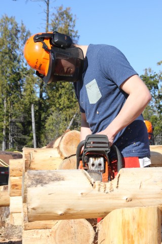 A chorus of chainsaws filled the maintenance yard of Ty-Histanis on the spring morning of March 18. With the sawdust flying around them in the cool air, a group of teenage boys diligently work over a small log cabin, marking where the joints should fit with carpentry pencils.