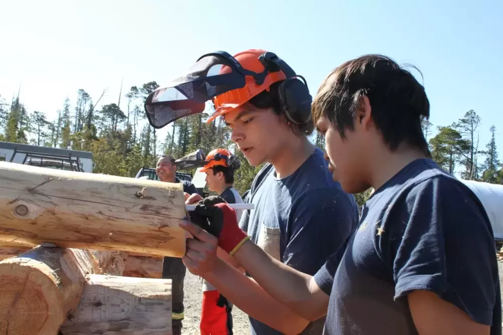The boys are from three chapters of the Warrior program, an initiative designed to foster leadership in young First Nations men. The lads cut through the logs under the direction of Edwin “Buckshot” Bikadi, a seasoned log cabin builder who travelled from his home with the Lil’wat Nation in B.C.’s interior to teach chainsaw operating.