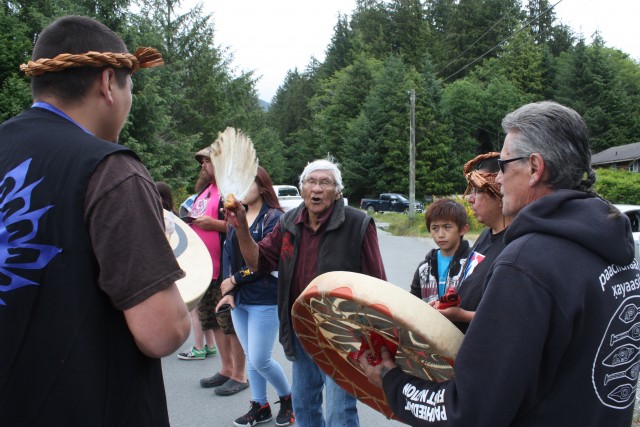 Led by elder Jimmy Chester, Ditidaht singers held the brushing ceremony for the new canoes, which were set up on trailers on the road next to the river. The Ditidaht men first performed a prayer chant, which they explained comes from Pacheedaht.